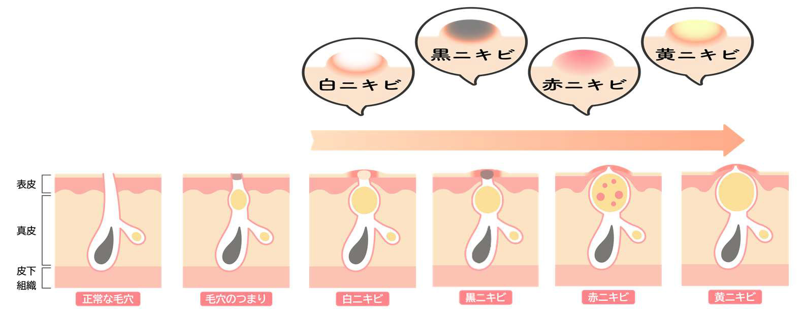 ニキビは、⼀⾒正常に⾒えますが触るとザラザラしている非炎症性ニキビ(① ② ③)から、⾚く腫れたり痛みを伴ったりする炎症性ニキビ(④ ⑤ ⑥ ⑦)へと進展していきます。